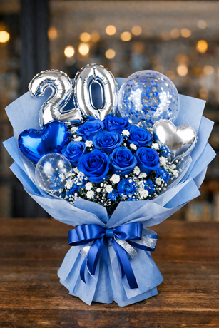 ↑青バラとバルーンを入れた花束:ご予算目安8000円前後