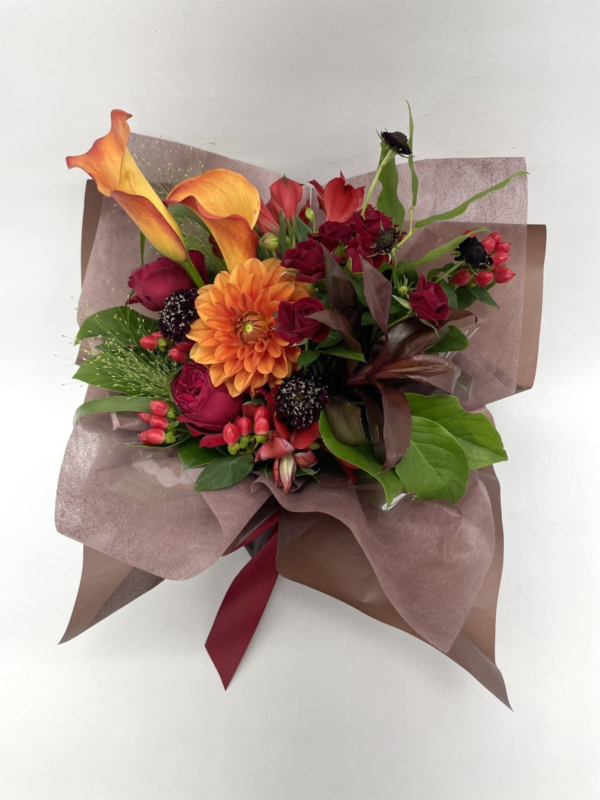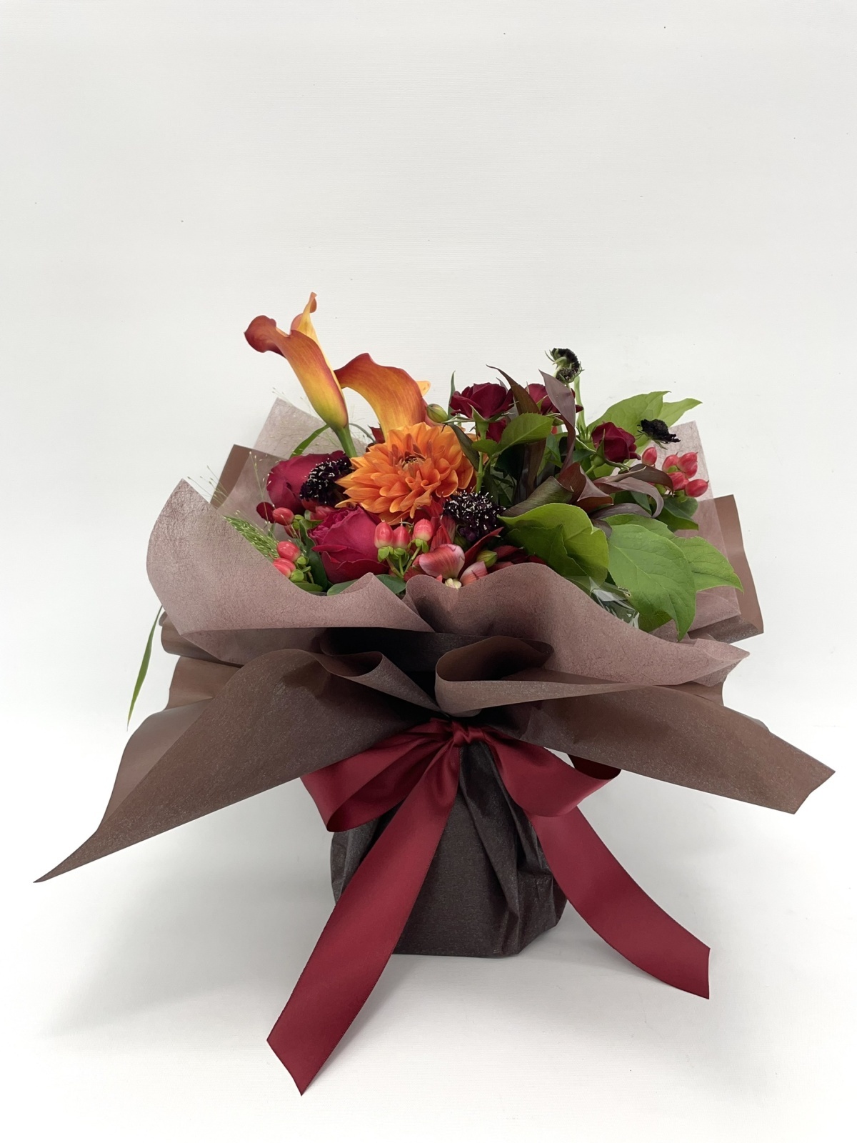 赤・オレンジ系の秋っぽいイメージでダリア入れて、ラッピングは大人なイメージ、とのご希望でスタンディングタイプのブーケに仕上げました。