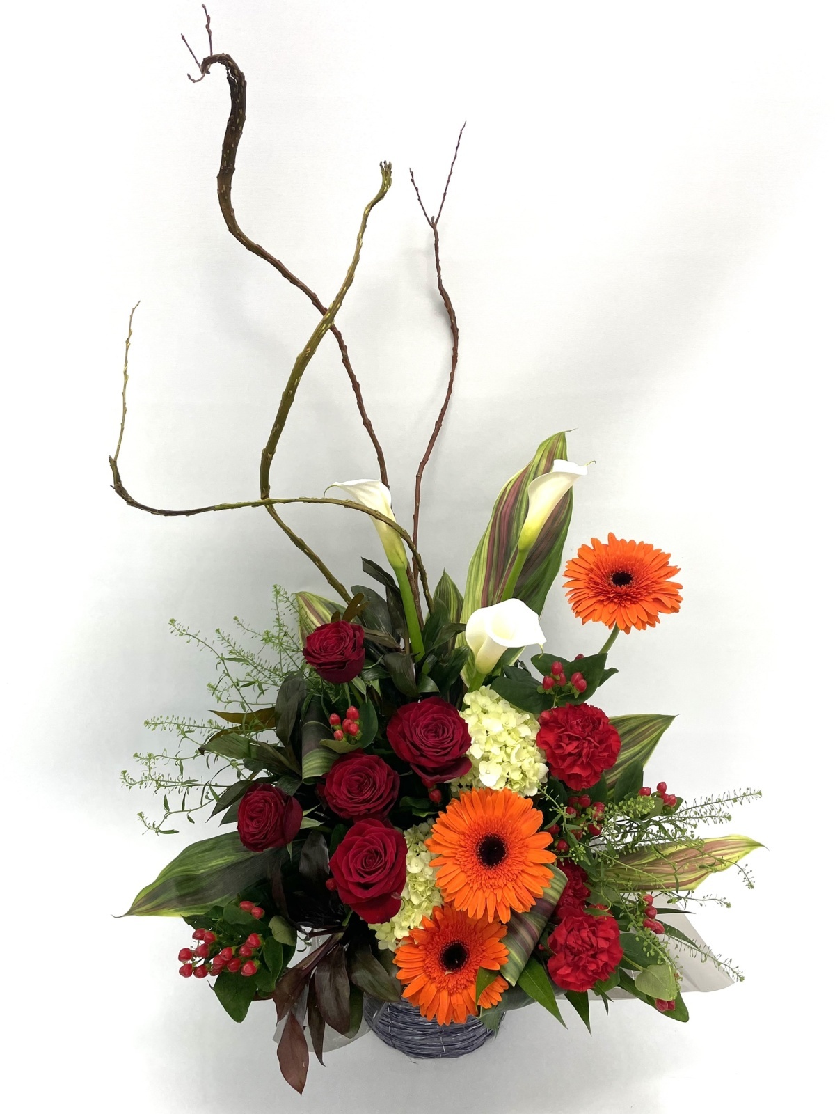 落ち着いた赤バラを中心に、オレンジのガーベラや白のカラーを合わせた、縦ラインを活かしたロングタイプの御祝アレンジです。
