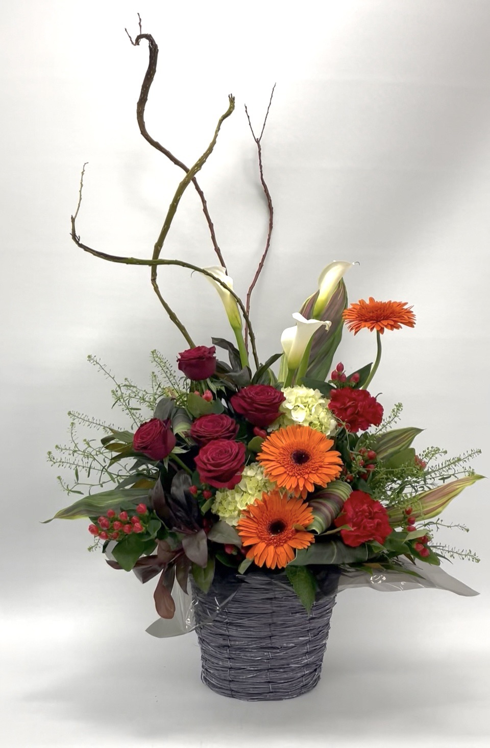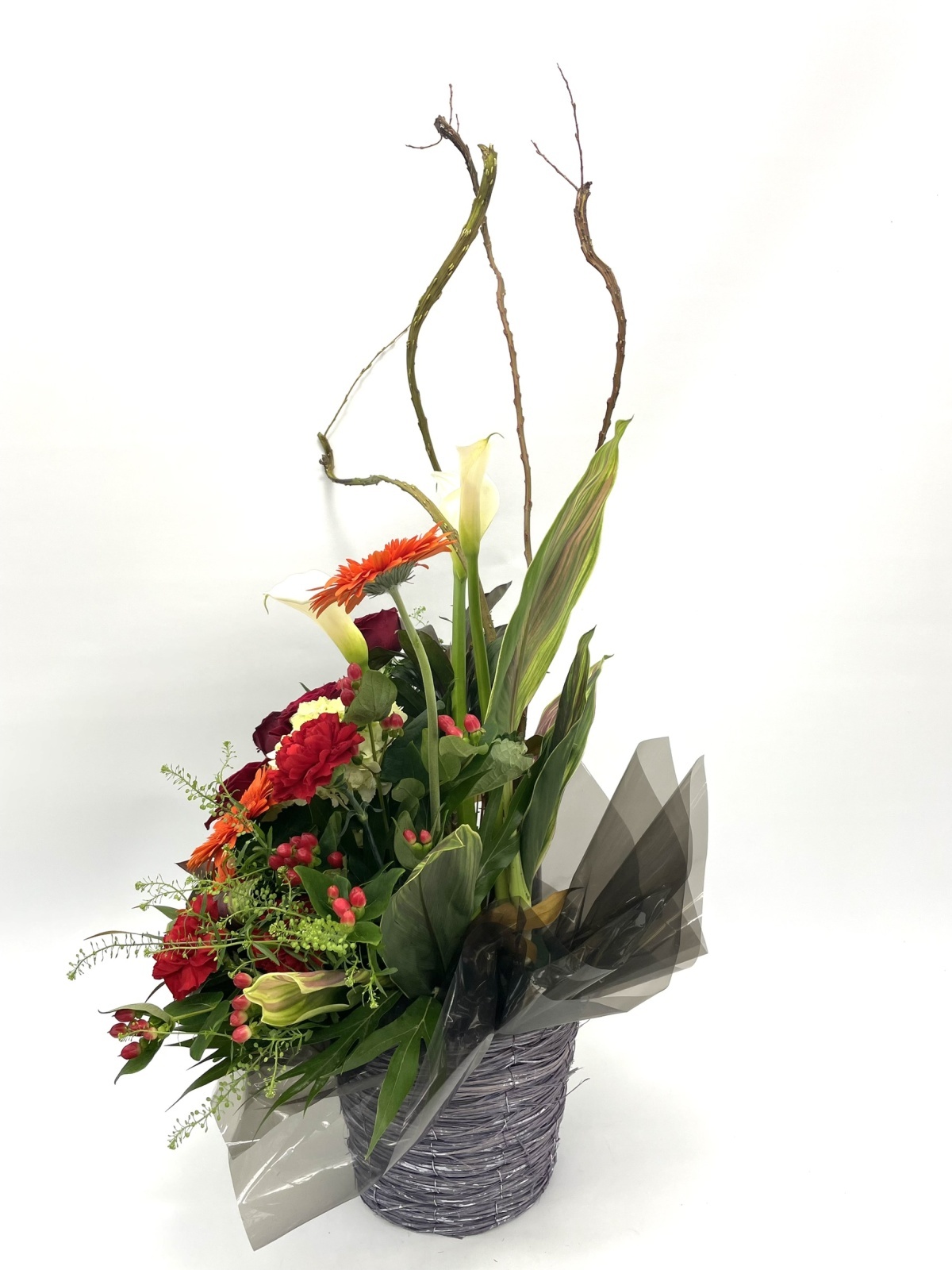 枝物をアクセントに、躍動感のあるフォルムに仕上げております。「オシャレで華やかに大きく」とのご依頼にあわせて、落ち着きと温かみのバランスを整えています。