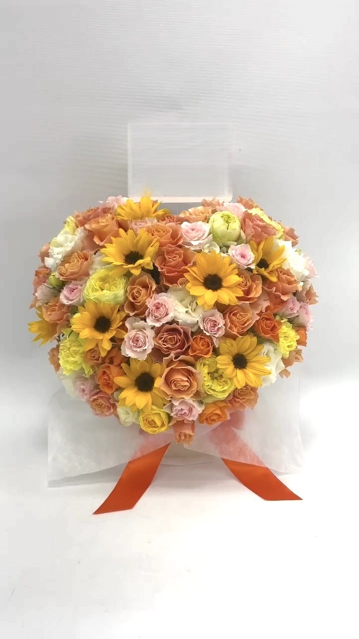 ひまわりに、オレンジ系とピンク系のスプレーバラ、白や淡い黄色のカーネーションなどを組み合わせ、立体的なハートに見えるよう花の向きや高さをそろえておまとめしています。