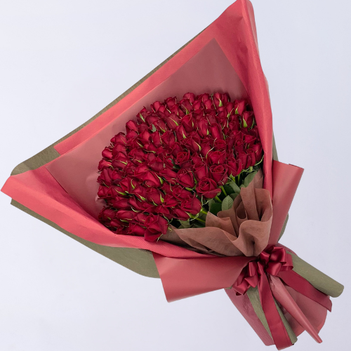 プロポーズの贈り物として、赤バラを108本でとのご依頼をいただきました。長さをいかしたロングタイプでお作りし、束ねたときのラインがきれいに整うよう1本ずつ角度を調整しています。