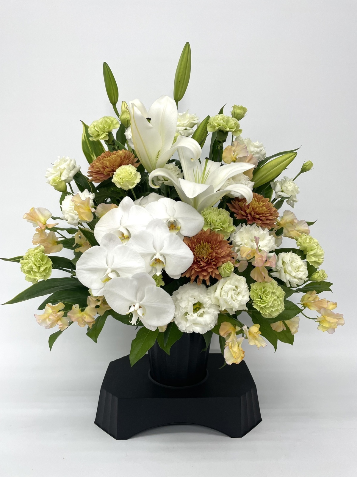 白ユリと白胡蝶蘭を中心に、トルコキキョウ、カーネーション、菊などを組み合わせた御供え用アレンジメントです。