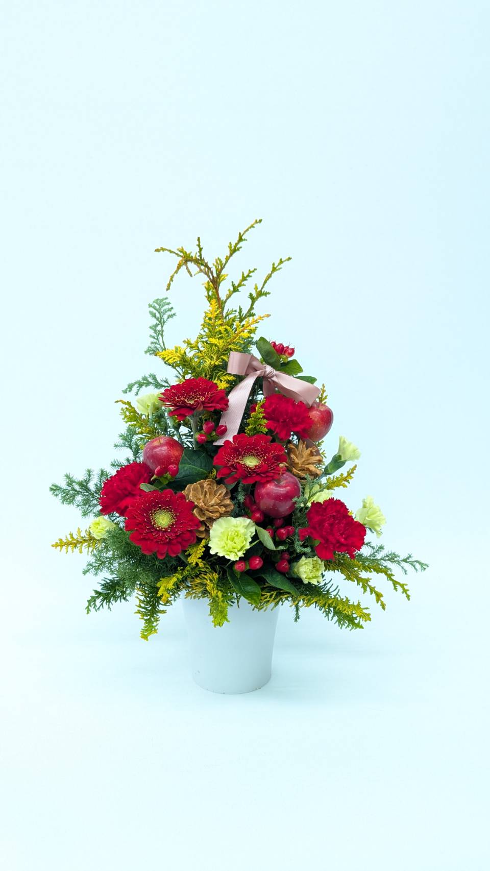 赤いガーベラを中心に、実ものや針葉樹系のグリーンを組み合わせ、クリスマスツリーをイメージしたアレンジメントです。