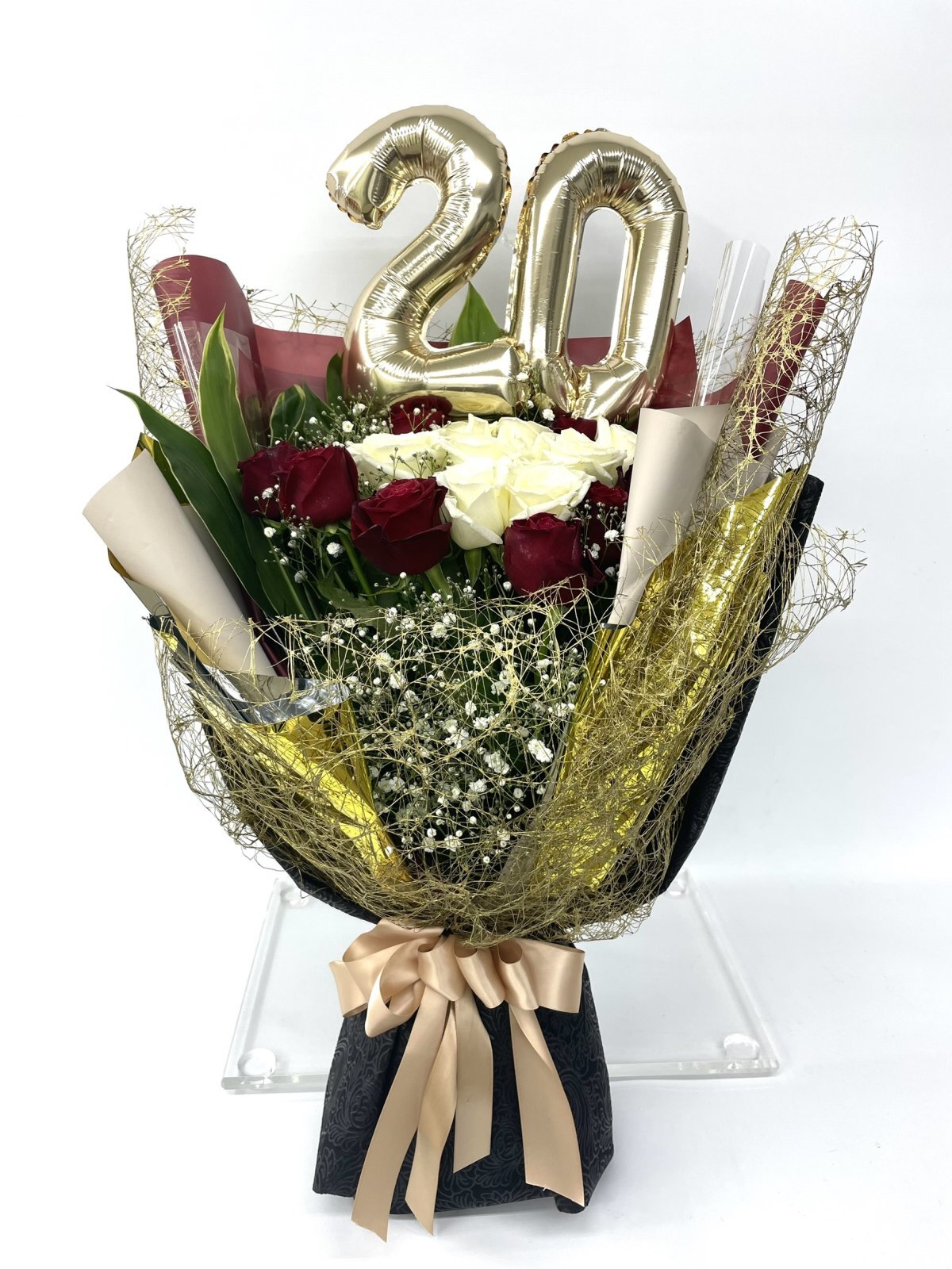 ゴールドの数字バルーン「20」を添え、成人という節目がひと目で伝わるよう工夫しました。