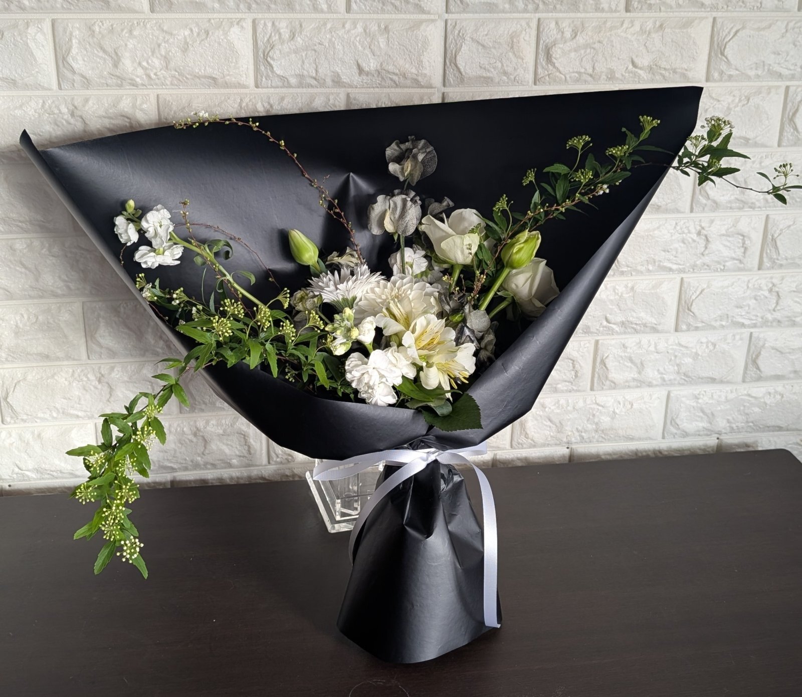 白と黒の花を、黒のラッピングに合わせて制作しました。