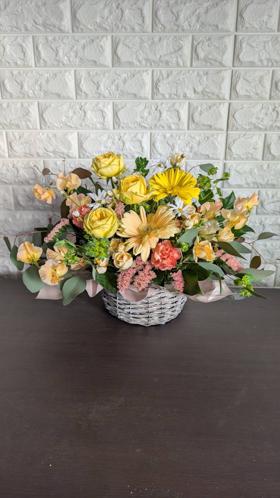 黄色系をご希望とのことで、バラとガーベラを中心に、やわらかい黄色からアプリコット系までの色幅で構成しています。