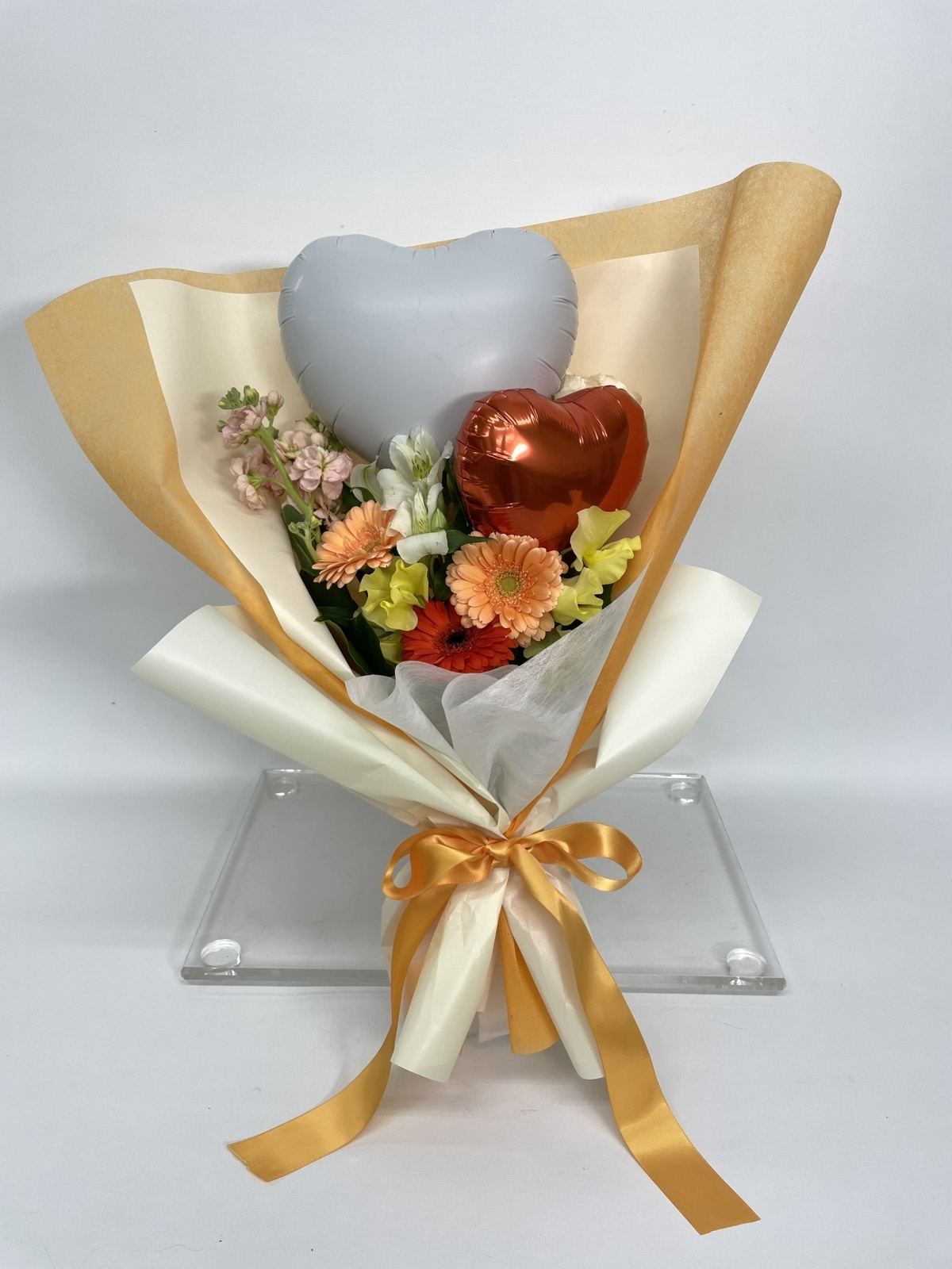花束の中にはハート型のバルーンを入れ、卒業のお祝いらしい雰囲気になるようまとめています。