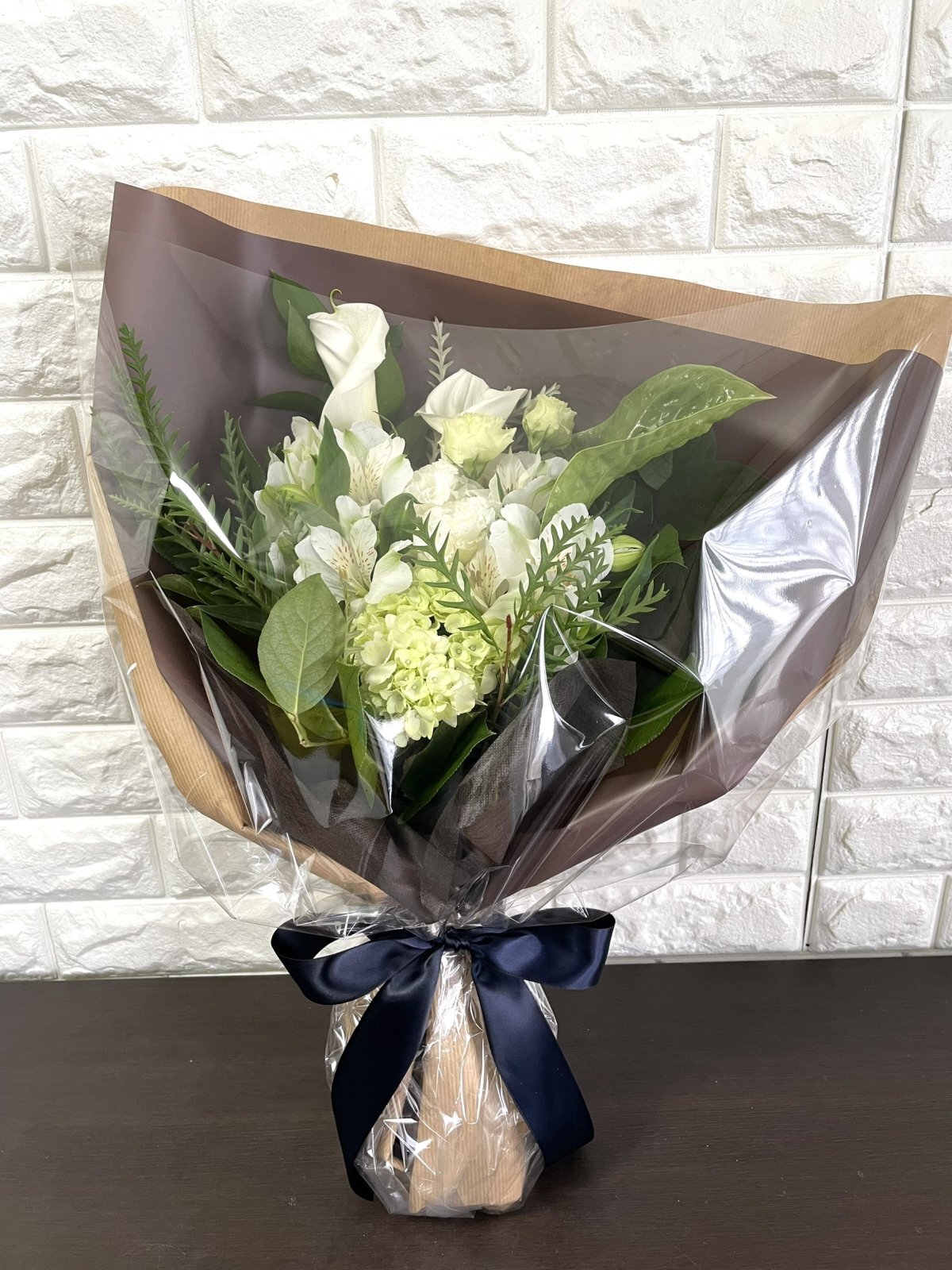 ラッピングはブラウン系のペーパーにネイビーのリボンを合わせ、男性への贈り物としてもお渡ししやすい雰囲気に仕上げました。