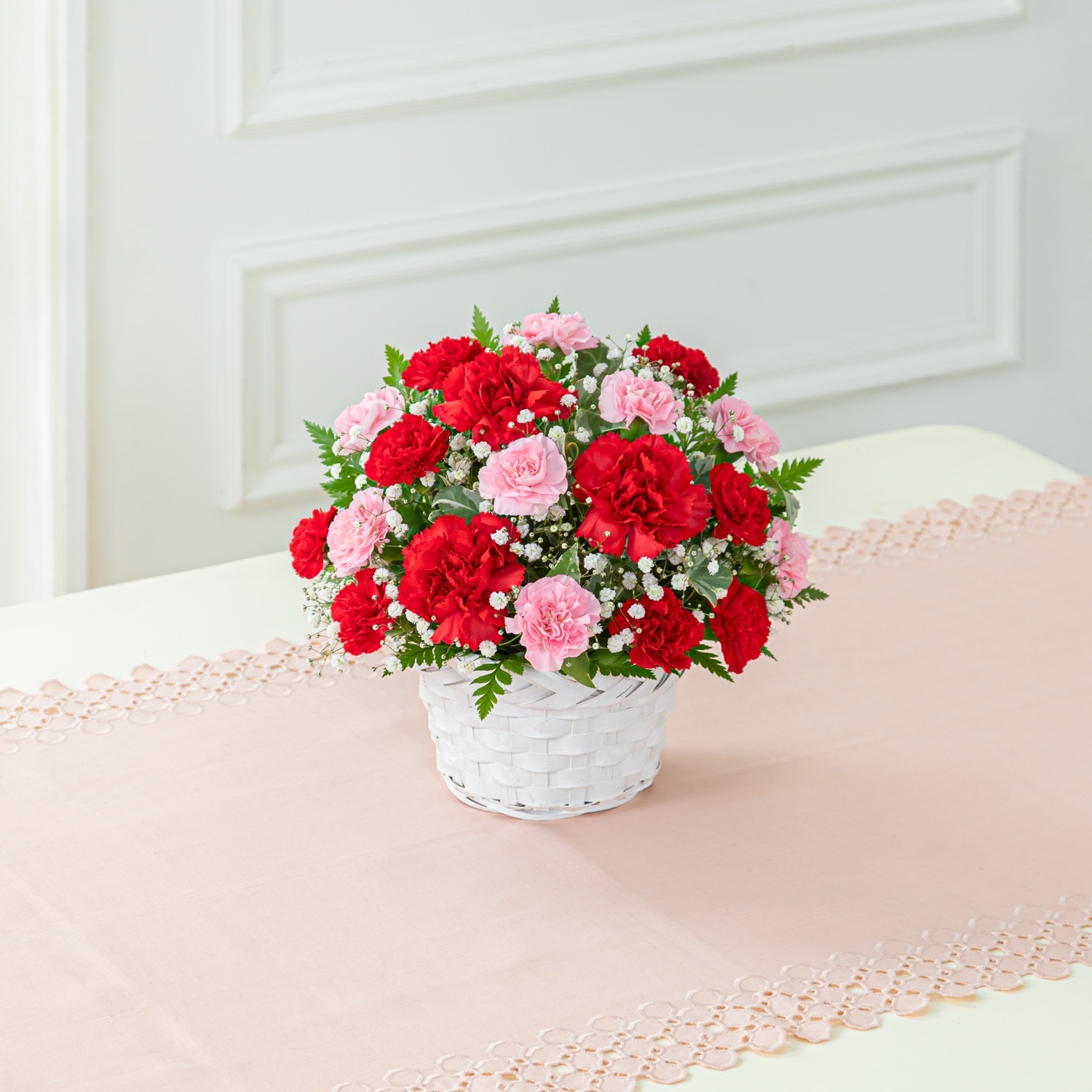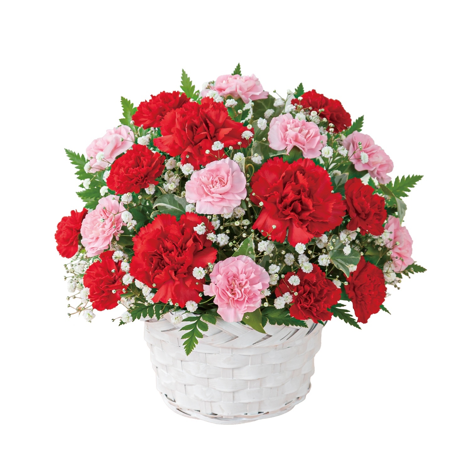 赤いカーネーションを中心にまとめたアレンジメント。母の日の贈り物として選ばれてきた定番の組み合わせで、感謝の気持ちを伝える場面に適しています。