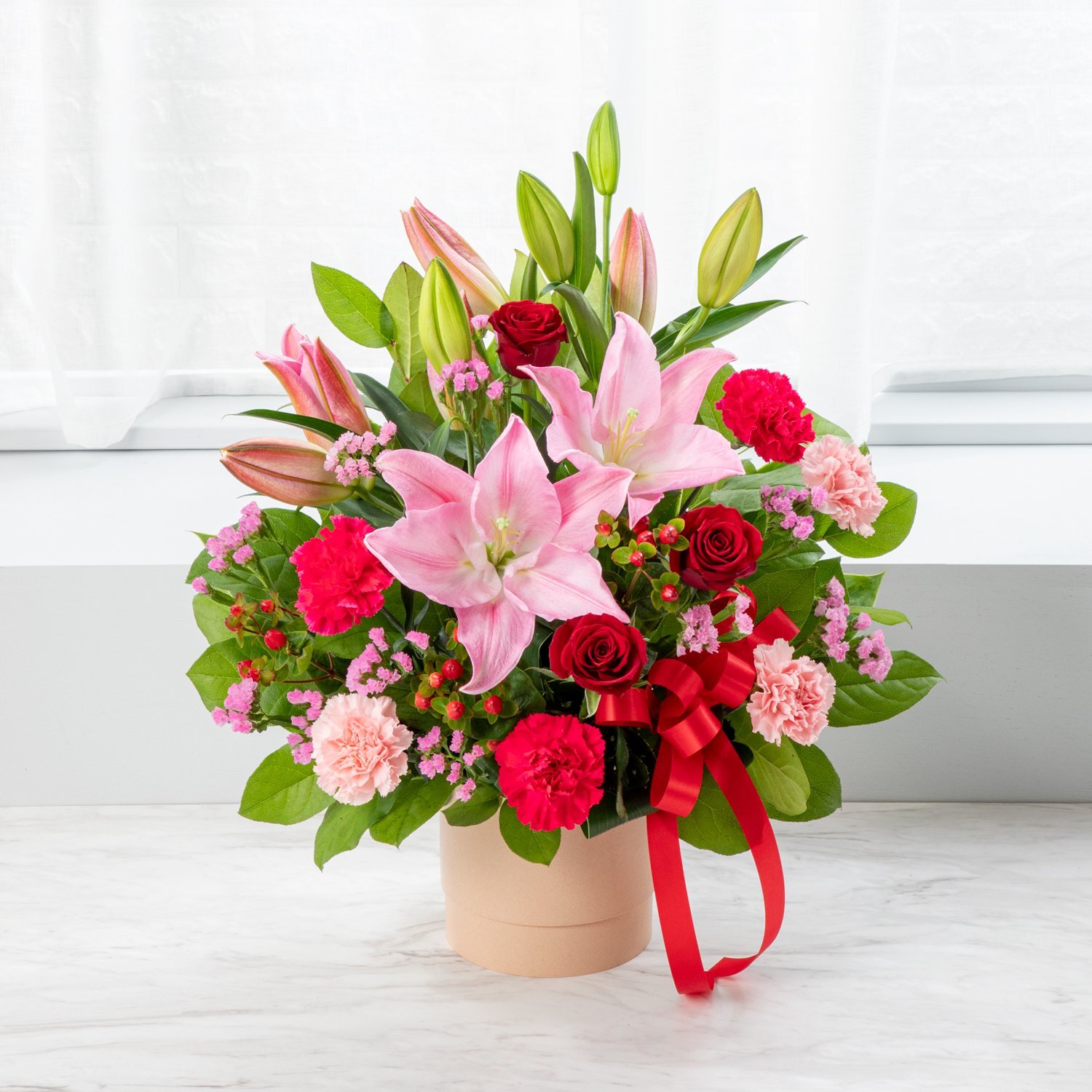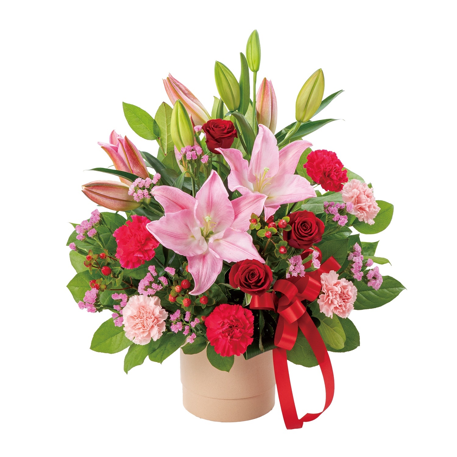 お母さんに人気があるユリ・バラ・カーネーションの花と、上品で華やかな赤いリボンを盛り込みました。
