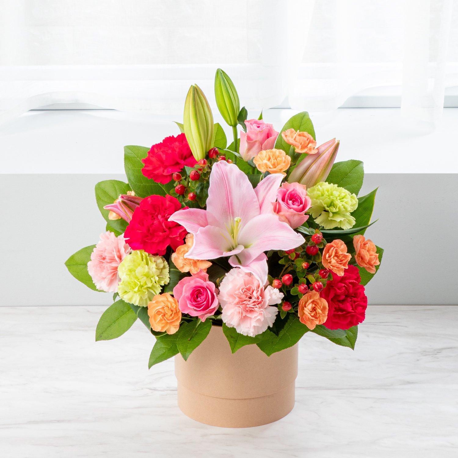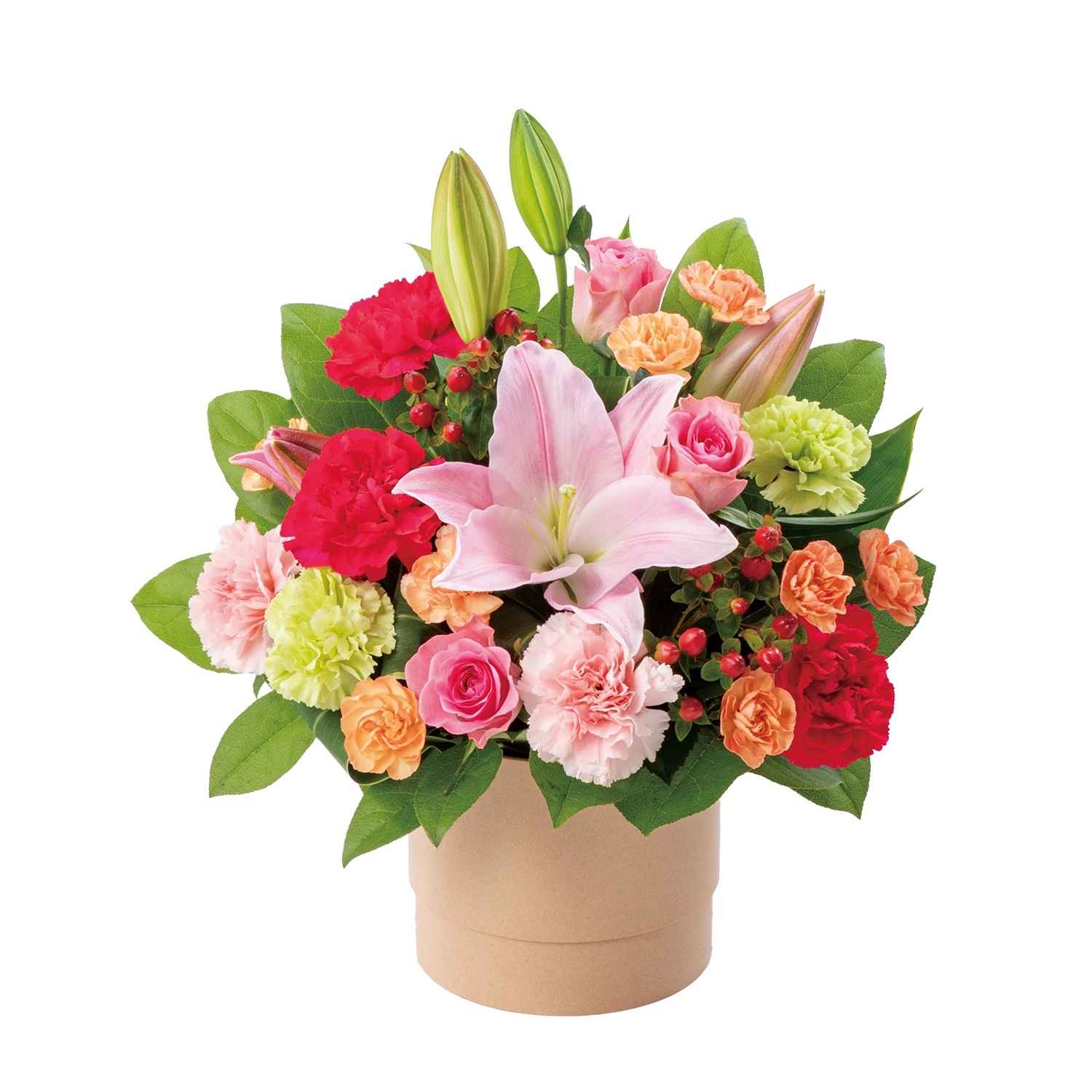 上品で存在感のあるユリとバラに、母の日の定番であるカーネーションをあわせたアレンジメント。カラフルな花でボリュームたっぷりに仕上げた豪華なフラワーギフトは、お母さんの節目などの特別な母の日にふさわしいプレゼントです。いつも見守ってくれるお母さんに、たくさんの花を贈って感謝の気持ちを伝えてください。