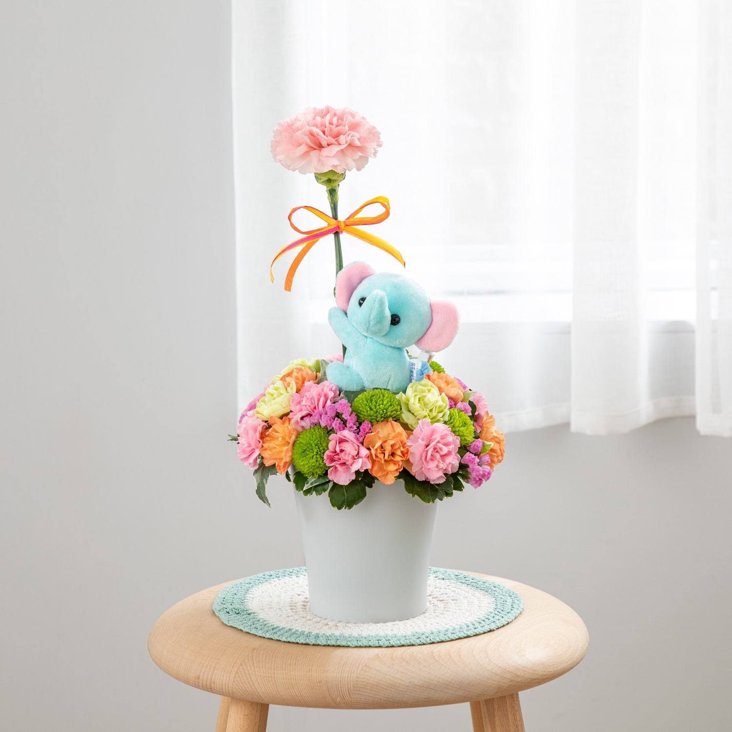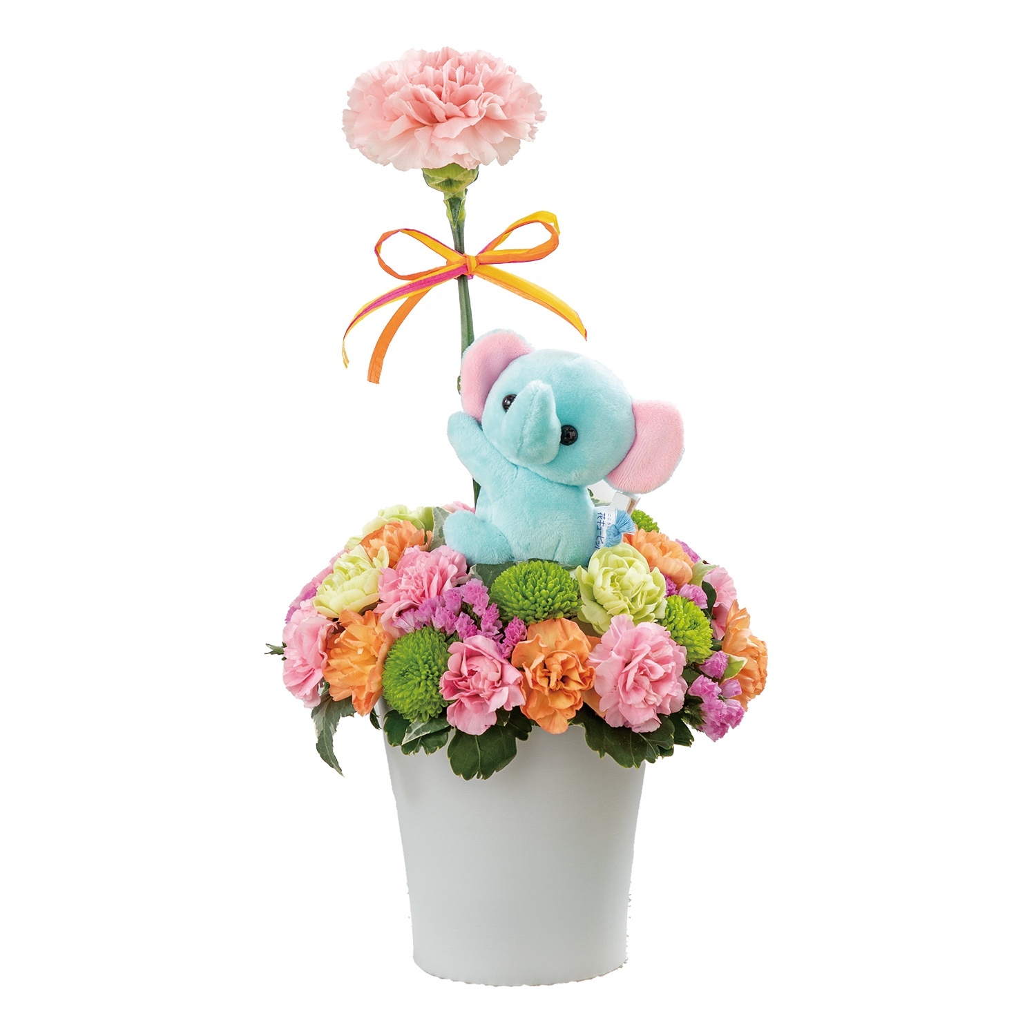 毎年人気のシリーズであるマスコット付きアレンジメントに、2026年は新たにぞうがラインナップしました。晴れ渡る空色のぞうのマスコットは、見るだけで爽やかな気持ちになるはず。カラフルな花畑にちょこんと座ったぞうが、母の日にぴったりなピンクのカーネーションを差し出す姿は可愛らしさ満点です。プレゼントを受け取ったお母さんも思わず笑顔になるような、花キューピット限定のフラワーギフトです。