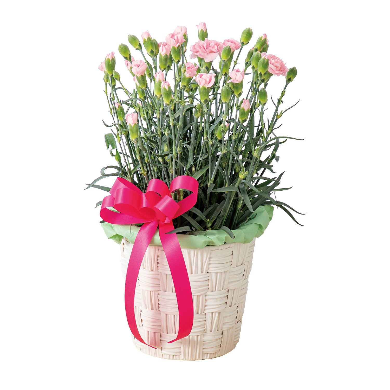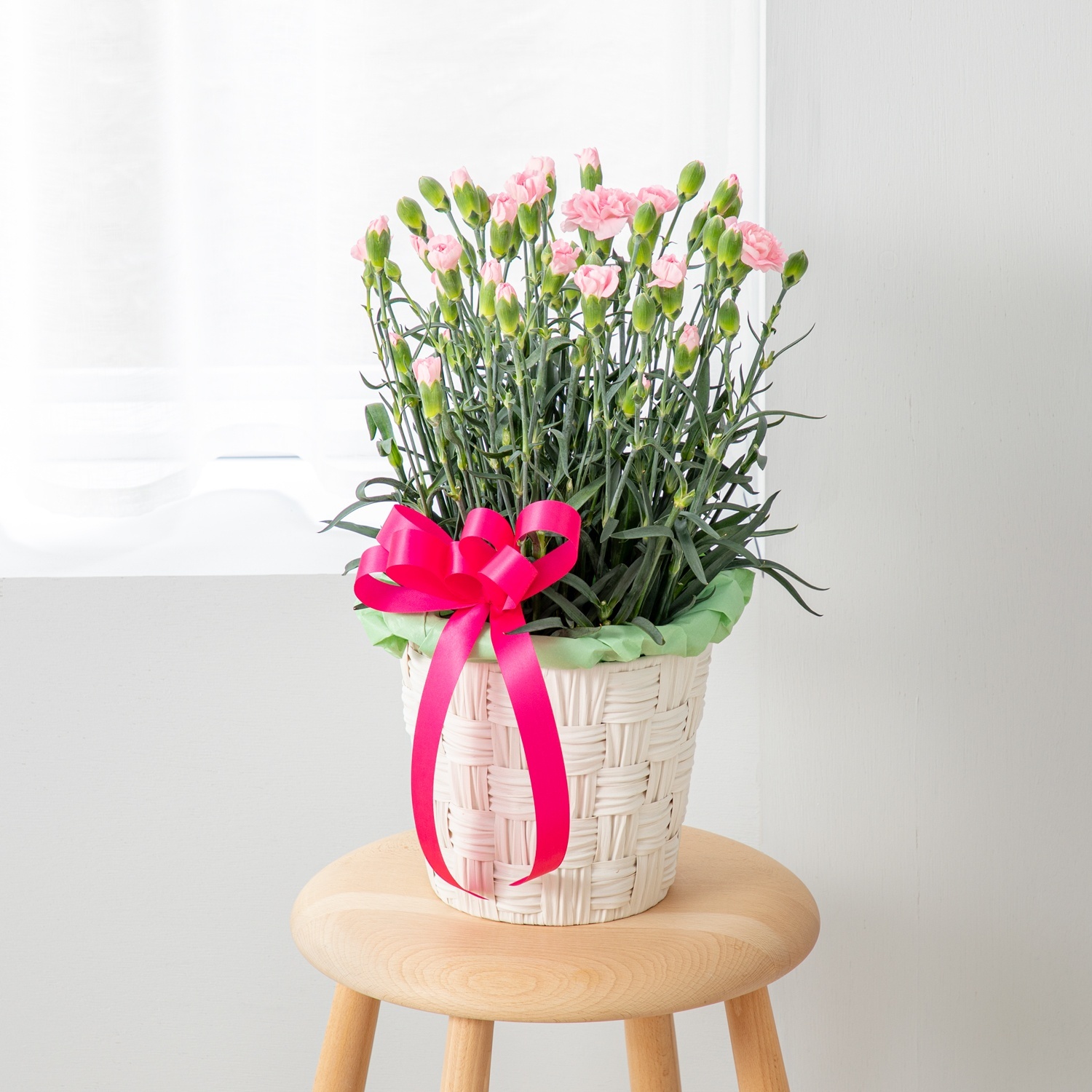 ナチュラルで可愛らしいカーネーションの鉢植え。ピンクのカーネーションの花言葉は「感謝」で、母の日に気持ちを伝えるギフトにぴったりです。華やかな濃いピンクのリボンがワンポイントとなっています。花やガーデニングが好きなお母さんに、ゆっくりと花の成長を見守る穏やかなひと時をプレゼントしましょう。