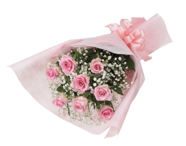 美しさと可愛らしさをあわせ持ったピンクバラと、「幸福」などの花言葉を持ったカスミソウを柔らかな色味のラッピングで包みました。お届け先がきっと笑顔になってくれるプレゼントです。